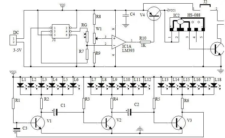 питание подаётся на музыкальную микросхему схему мигания светодиодов