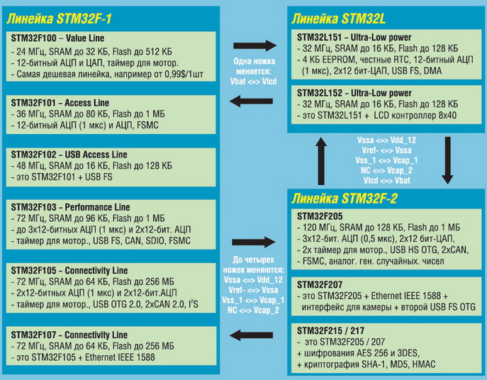 pin-to-pin совместимости с семействами STM32F-1, STM32F-2 и STM32L. Это
