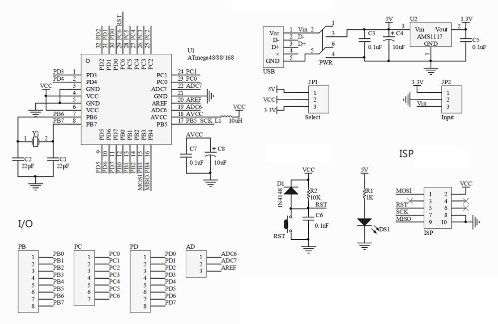 Печатная плата для микроконтроллеров AVR ATmega8/48/88/168 в корпусе TQFP предназначена для самостоятельной сборки отладочной платы. На плате есть контактные площадки для всей необходимой обвязки и кнопок рестарта и выключения питания, стабилизатора напряжения на 3,3 В, разъёма Mini USB. Также на плате AVR разведены пины GPIO и разъёма для внутрисхемного программирования ISP.