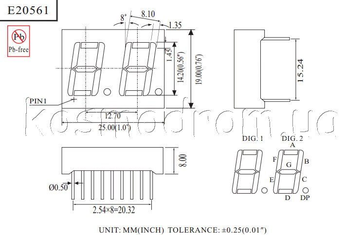 двухсимвольных семисегментных индикаторов с высотой символа 0,56