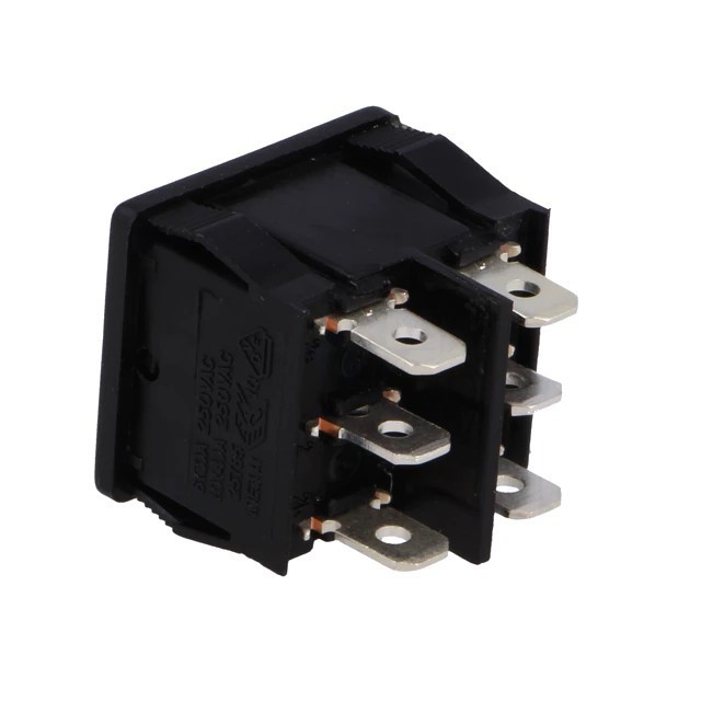 Фото может отличаться от реального вида предмета, но это не влияет на основные характеристики изделия | Микропереключатель рокерный RS1333DBB7 ROCKER, DP3T, Пол: 3, ON-OFF-ON, 6A/250ВAC, черный, нет, R13-33-AC