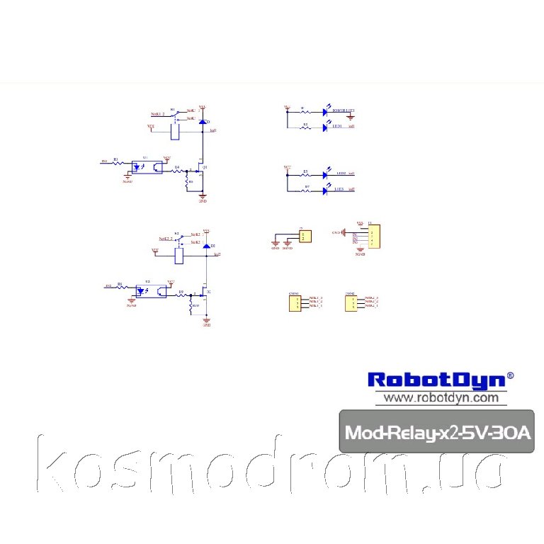 Двухканальный релейный модуль для коммутации нагрузки. Напряжение питания 5 В. Iкомм. 230В 30А переменного тока или 30В 30А постоянного тока.
