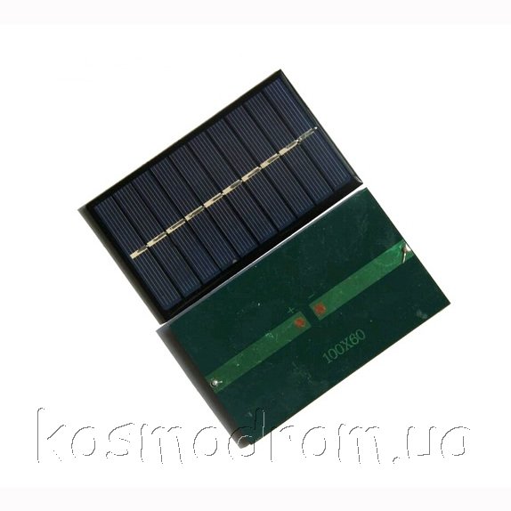 Солнечная батарея из поликристаллического кремния. Мощность: 0,75 Вт. Рабочее напряжение 5 вольт. Размеры: 100х60х3 мм.