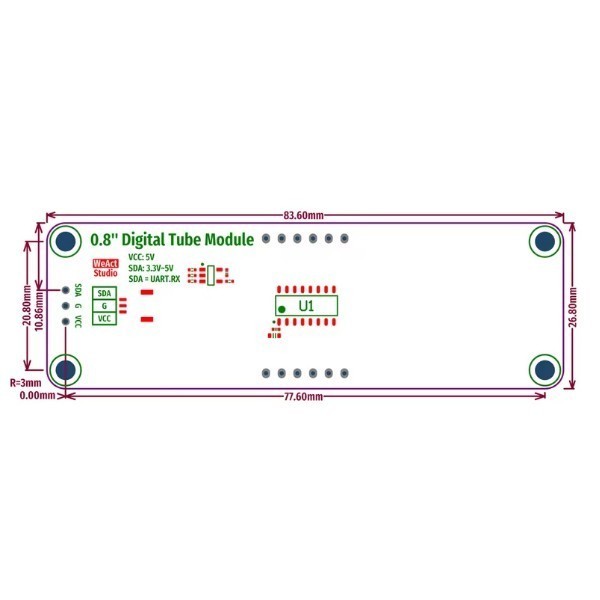 TM1652 0.8 Inch 8.8:8.8 BLUE — компактный модуль индикатора на базе драйвера TM1652 с двухразрядным 8-сегментным светодиодным дисплеем зелёного цвета.