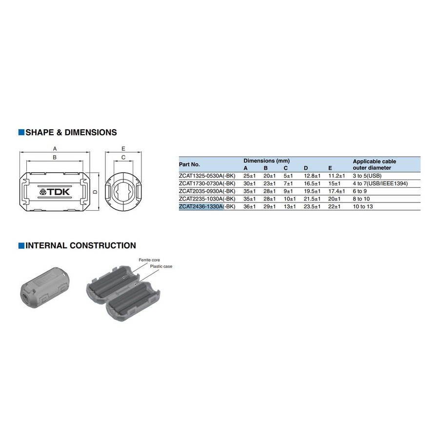 Фото может отличаться от реального вида предмета, но это не влияет на основные характеристики изделия | Ферритовые помехоподавляющие сердечники ZCAT2436-1330A-BK Феррит: двухэлементные, на круглый провод, A: 36мм, В: 29мм, С: 13мм, D: 23,5 мм