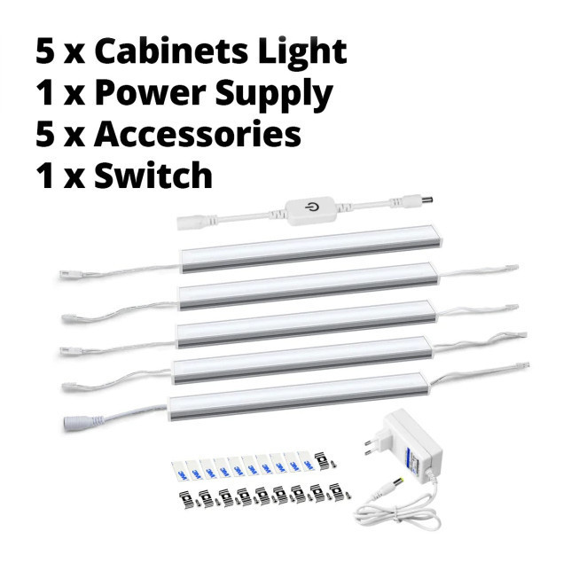| 5xLamp-Motion-White-50 Светодиодные линейки для подсветки интерьера Набор для подсветки: пять ламп + источник питания, бесконтактное включение, холодный-белый, 50 см
