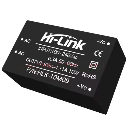 | HLK-10M09 Модульный сетевой источник питания на плату AC/DC преобразователь на плату в пластиковом корпусе.Мощность: 10 Вт. Входное напряжение: 220В Выходное напряжение: 9В, Вых. ток:1100 мA ном.Кол-во выходов: 1, 46.9x27.8x21.8mm