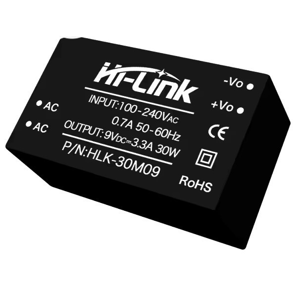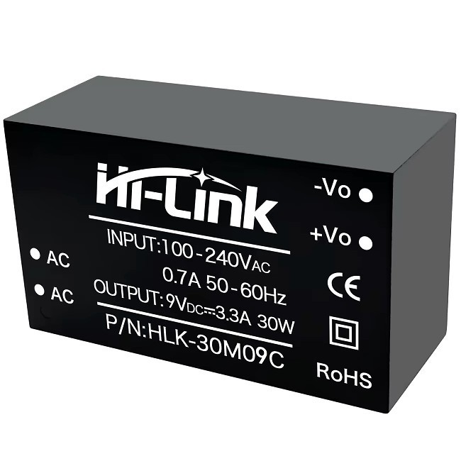 | HLK-30M09 Модульный сетевой источник питания на плату AC/DC преобразователь на плату в пластиковом корпусе. Мощность: 30 Вт. Входное напряжение: 220В. Выходное напряжение: 9V. Вых. ток: 3300mA